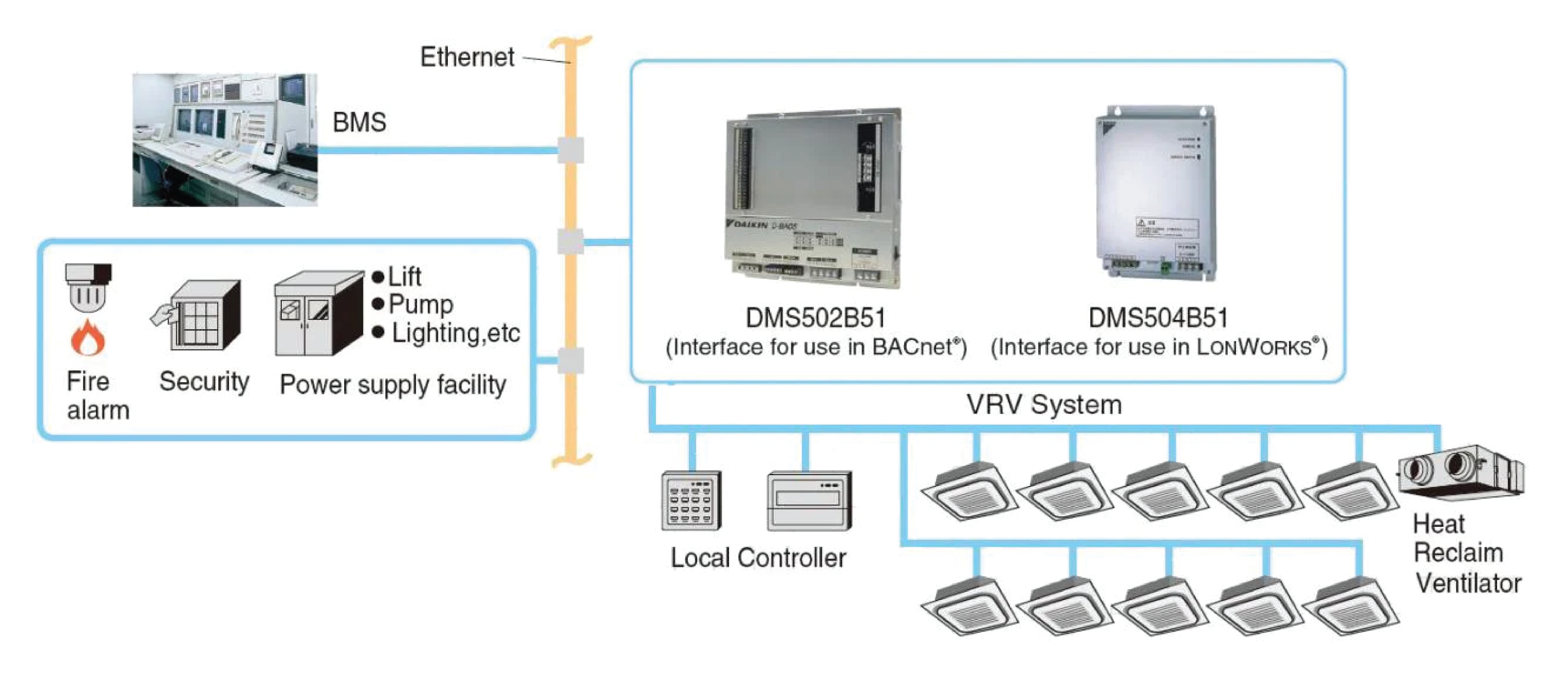 The BACNet interface allows a Building Management System to control all of Daikin’s product range including VRV, Ducted or Cassette systems and our split systems. The BACnet Interface uses a standard open protocol based on ASHRAE Standard 135. Through a single BACNet interface*, up to 256 indoor unit groups and 40 outdoor units can be controlled and monitored via the BACNet Building Management System.