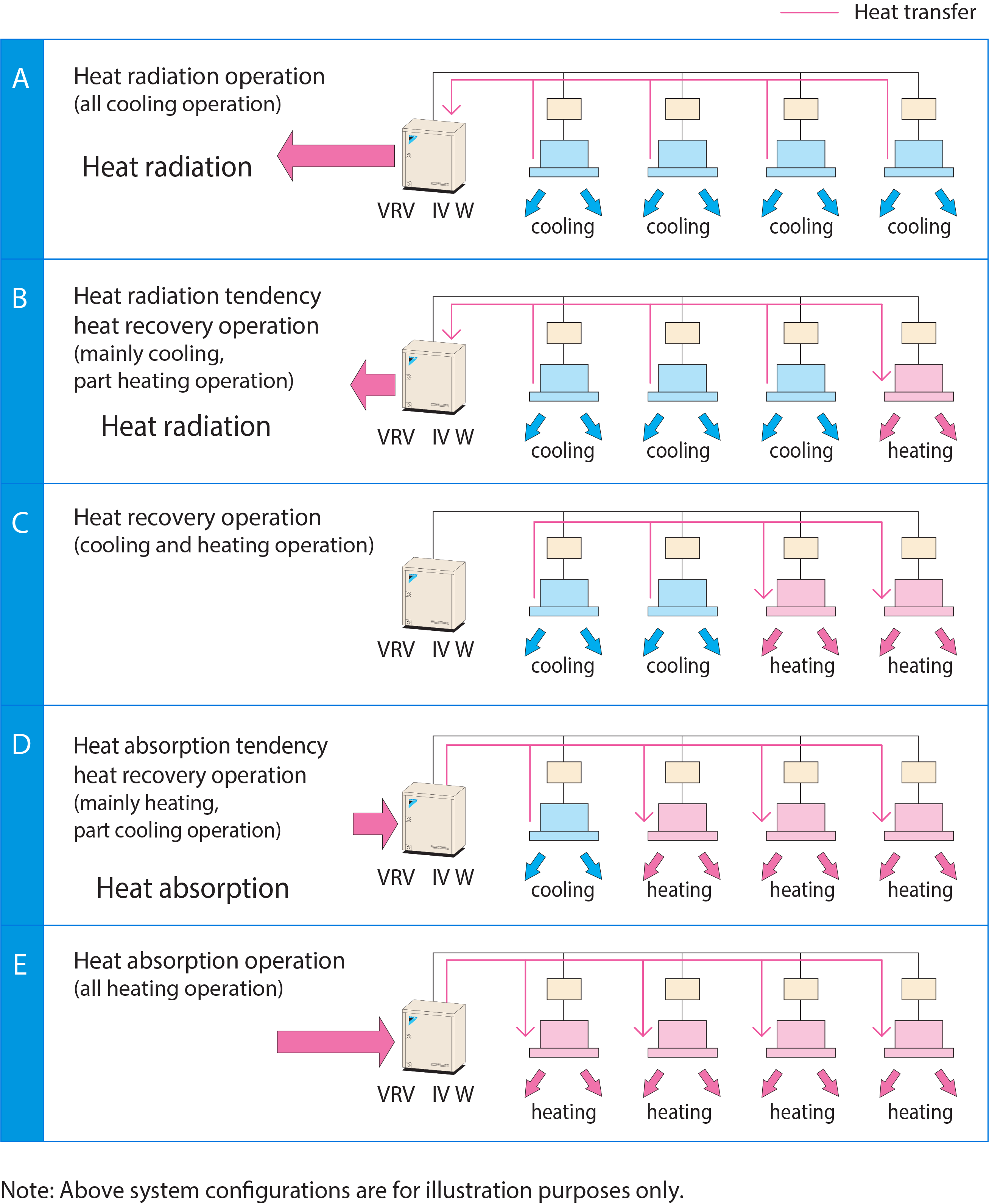 In mainly cooling, partly heating mode, the system recycles heat exhausted from the cooling operation to use for heating. In mainly heating, partly cooling mode, the system uses cooled post-heating operation refrigerant for cooling. Efficiency improves the more simultaneous operation is performed.