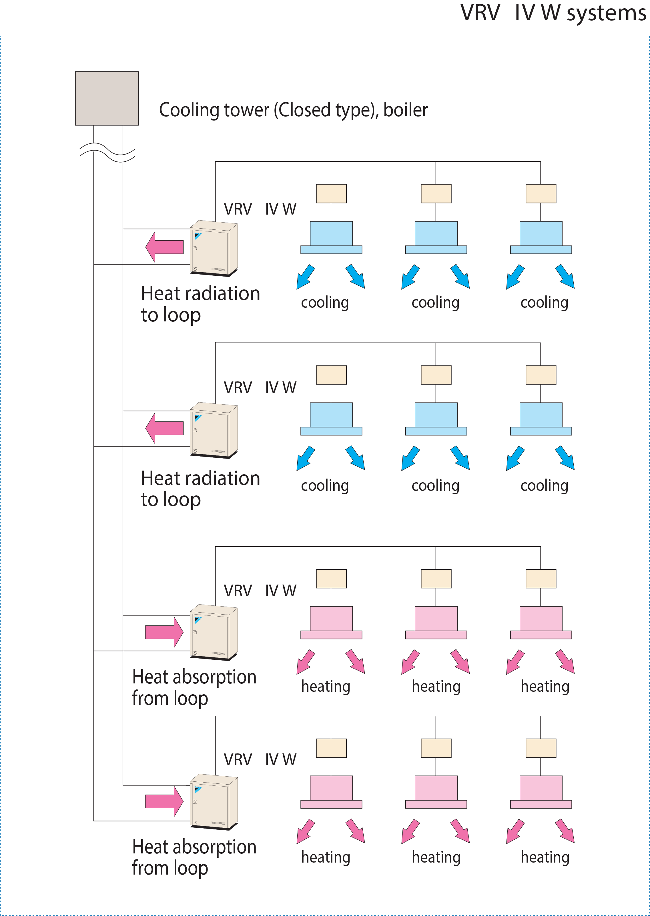 - VRV IV-W condensers are connected to the water loop and the connecting refrigerant circuit serves indoor units the same as any air cooled VRV system.