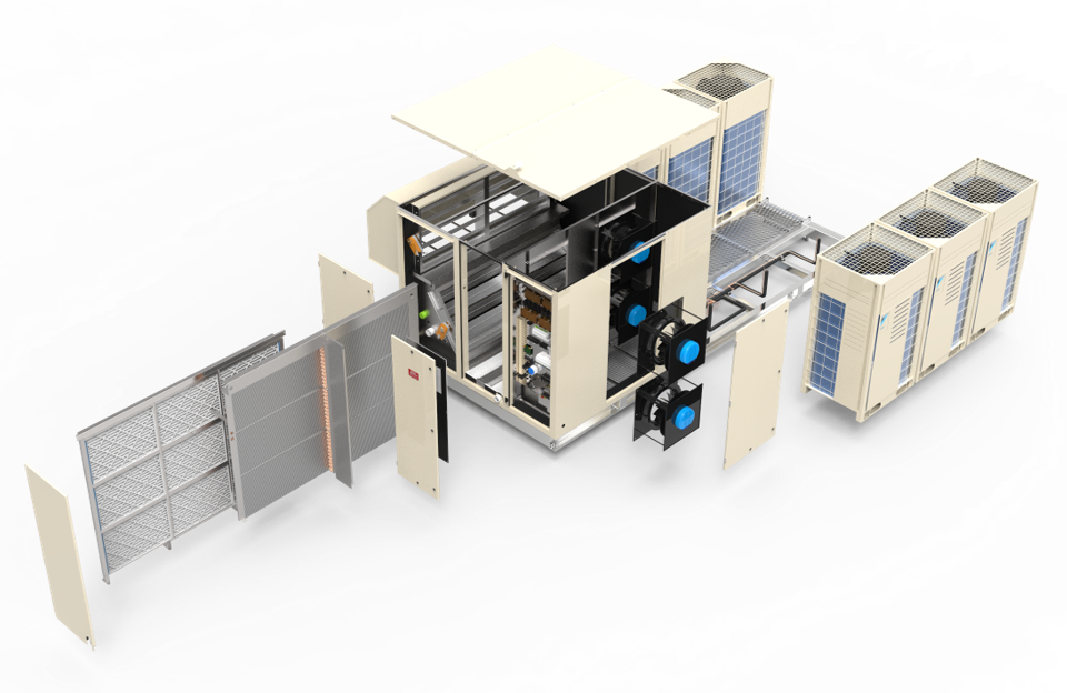 The Daikin high-efficiency rooftop package air conditioning system is designed for large spaces such as shopping centers, warehouses, and halls. It combines a proprietary AHU with VR Heat Pump condensers and features advanced control with CO2 monitoring, economy cycle, and BMS integration. Ideal for commercial applications.
